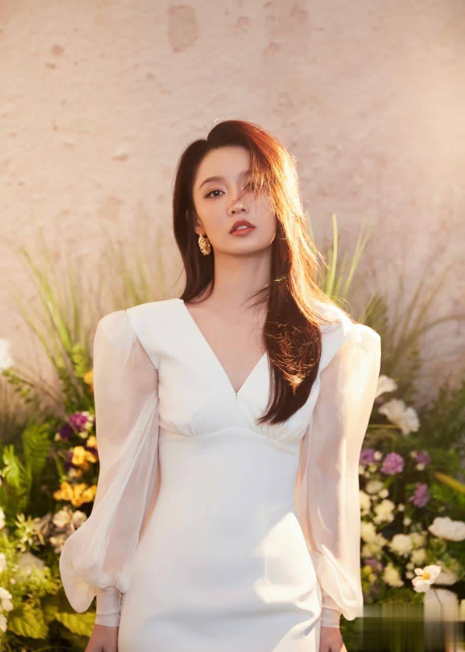 一袭白色V领泡泡袖长裙,置身于柔和的暖黄色调背景中。发如瀑,眸若秋水,一抹红唇更衬得她肌肤胜雪。她左手轻搭胸前,姿态娴静优雅,金色大圈耳环为整体造型增添一丝灵动时尚感。仿佛从梦境中走来的仙子,温柔却不失气场。
