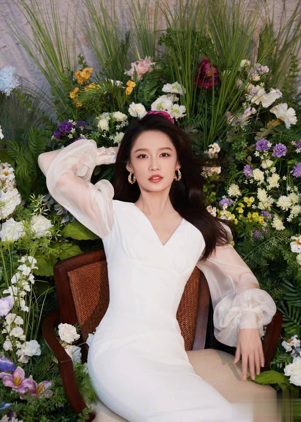 斜倚在软垫座椅上,被粉白绿相间的花丛环绕。她笑容甜美眼神明亮,既有少女的清新,又有轻熟女的优雅,氛围感直接拉满。