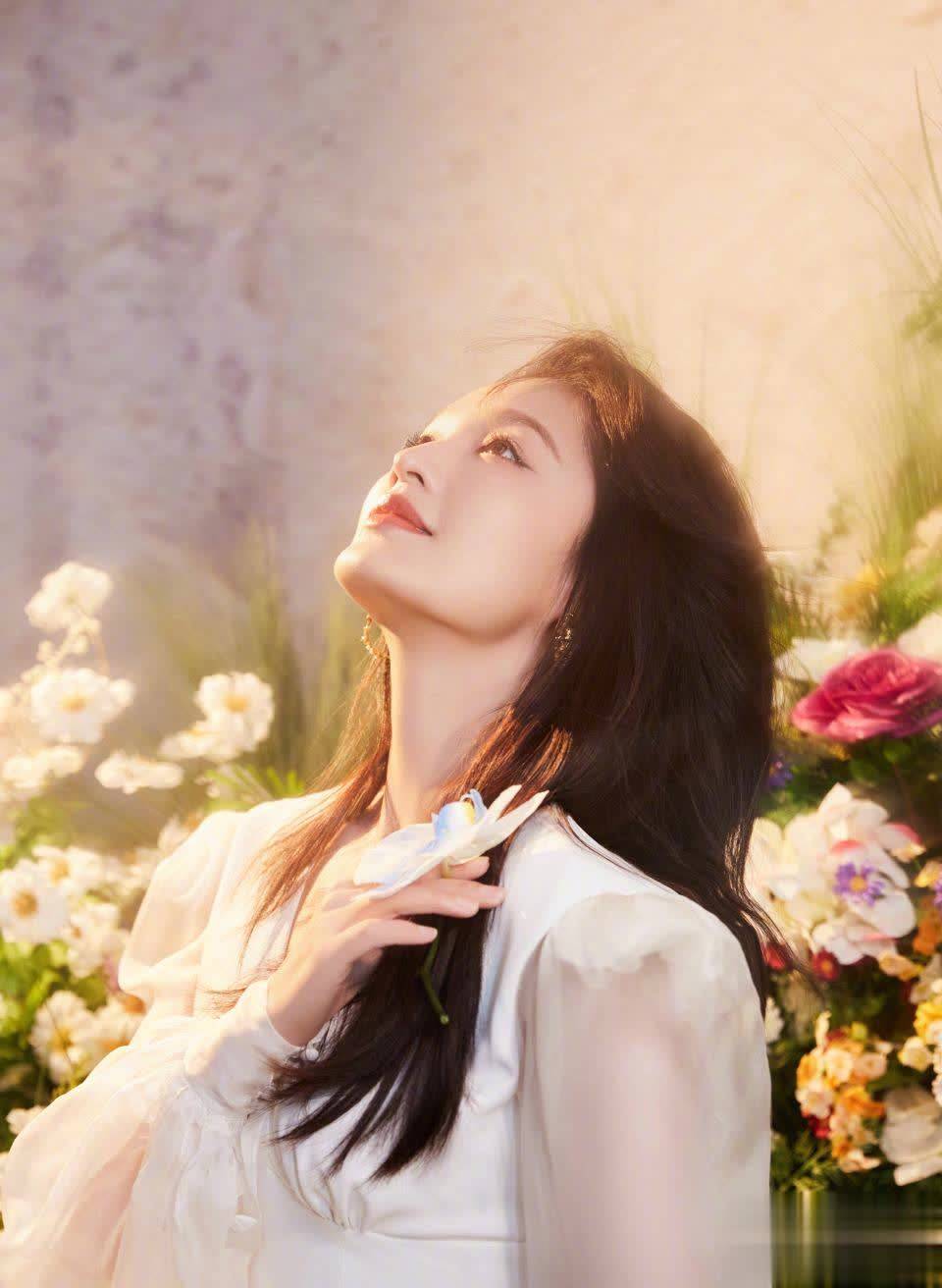 长发随风轻扬,宛若油画中走出的少女。背景墙面素雅,花草缤纷,她自信从容的眼神与微扬的眼线相得益彰,整体造型既清新又充满女神气场。